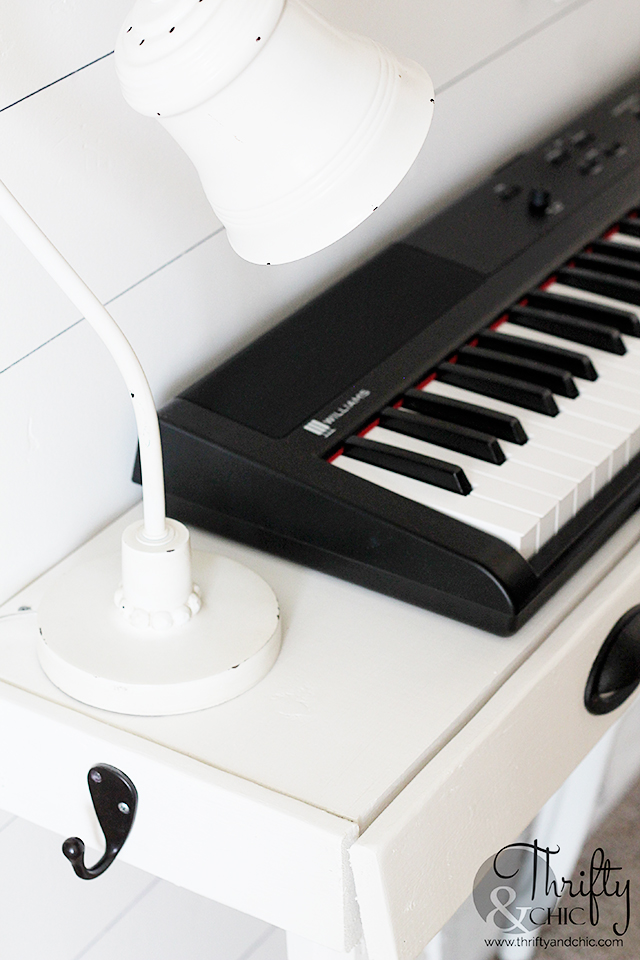 As for the extras on this piano stand, I added a hook for the piano bag that holds all the music for piano lessons. I added a little extra light with this cute lamp I found at Hobby Lobby. You couldn't tell from the pics, but this space gets almost no light. It's soooo dark. I had to open up all the windows up here to get some decent lighting for pictures. But, when the windows are closed, and when it's night time, there's a big need for a little more light.