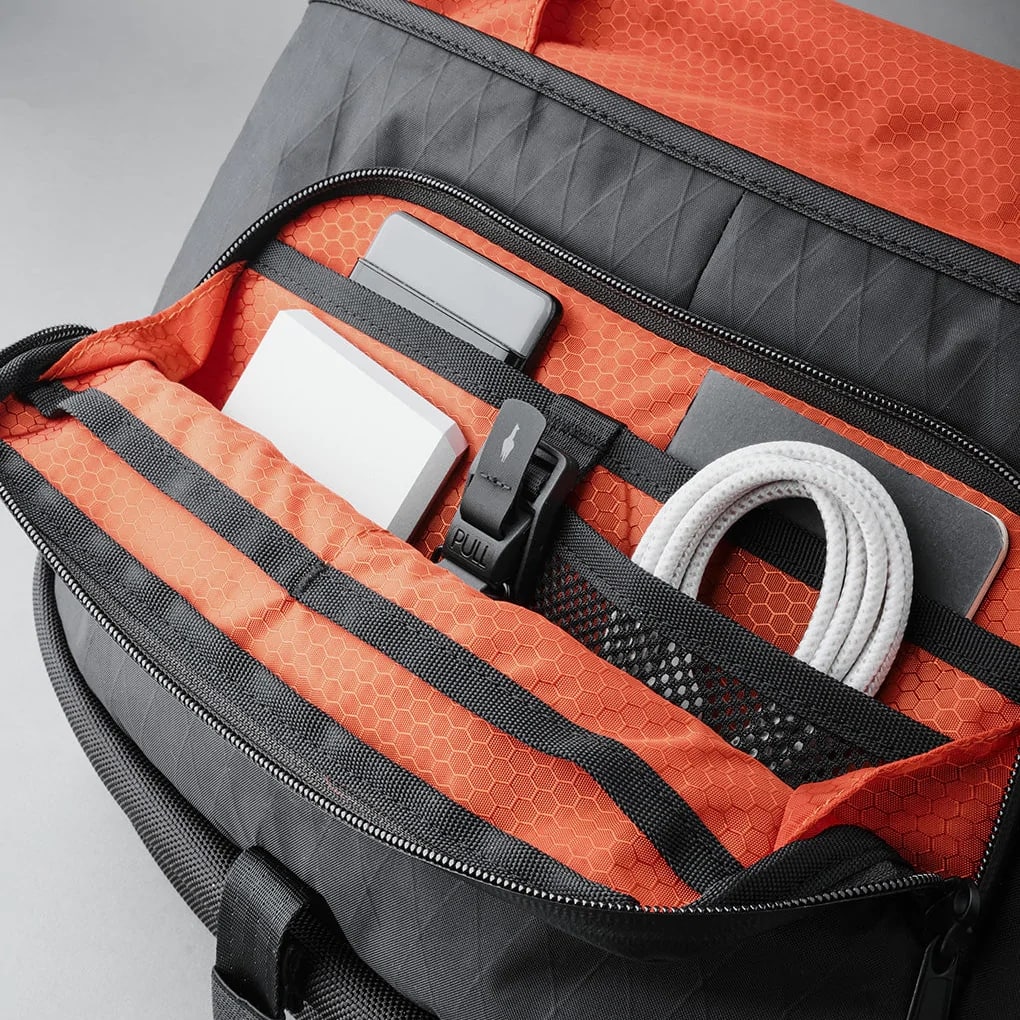 Much like on the Alpha Messenger Bag, the Elements Backpack is made from premium weatherproof materials featuring weatherproof fabrics + DWR coating that will keep your gear safe. It features a padded laptop compartment that will fit up to a 16″ laptop and the interior pockets will ensure you have space for all the cables and chargers without needing to have them loose in the bag.