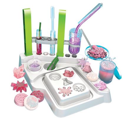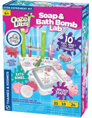 In this pretend STEM scenario, you are a chemist for a bath and body products company and its your job to make and test different cosmetic products. Use the tools in your laboratory to employ different scientific techniques and essential chemistry principles to make soaps and bath bombs. Try out different additives to affect the color, smell, and other qualities of the products you make. As you mold different glycerin soap shapes, you learn about the chemical properties of soap that help it pick up and wash away dirt. All materials and chemicals are non-toxic. Ages 6 & up. MSRP: $29.95.