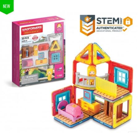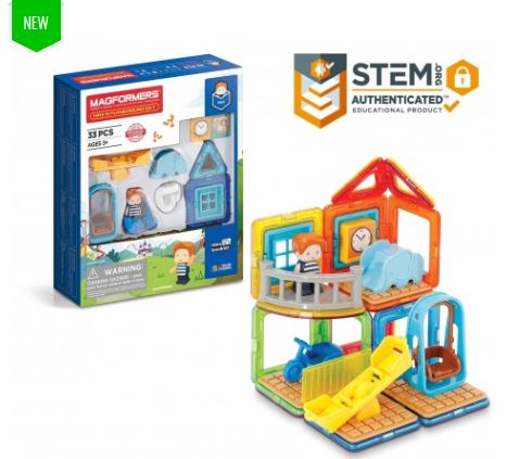 Click, Connect, Create! Explore endless construction possibilities with Magformers Mini House Sets! Your little one can build anything they can imagine when they use the Magformers Magnetic Rainbow shapes, characters and accessories included in, Maxs Playground Set, Maggys House Set, Minibot Kitchen and Milos Mansion Set. Compatible with all Magformers, add Milo, Minibot and Max sets for extended building fun! Ages 3 & up. MSRP: $49.99.